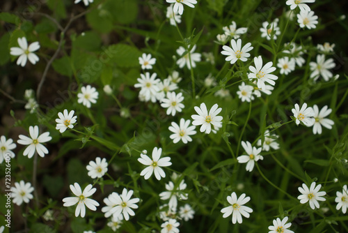 White flowers in green on a spring day on top of Rotenfels cliffs near Bad Munster, Germany.