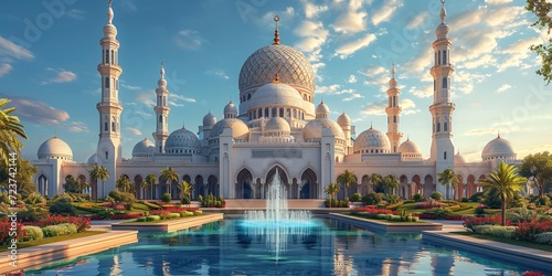 Arabian Nights - A stunning white mosque with a blue fountain and a beautiful blue sky in the background. Generative AI