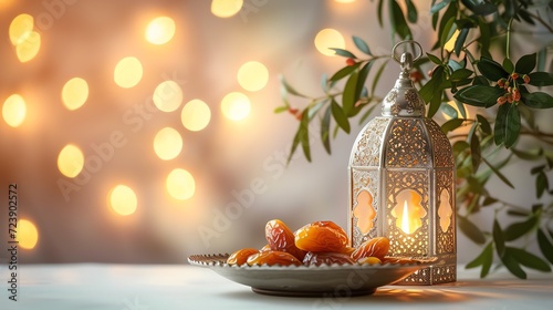Plate with dates fruit, burning silver Moroccan. Ramadan Kareem greeting card, invitation. Arabic lantern. Generative AI