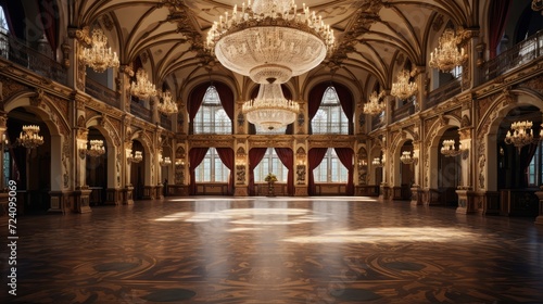 Grand ballroom with chandeliers, where a coronation is taking place, the crown held aloft before a cheering crowd