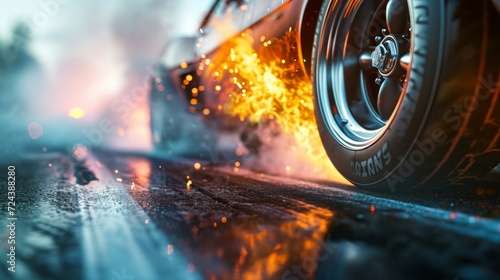 A closeup of a drag racers burned rubber tires as they peel out at the starting line.