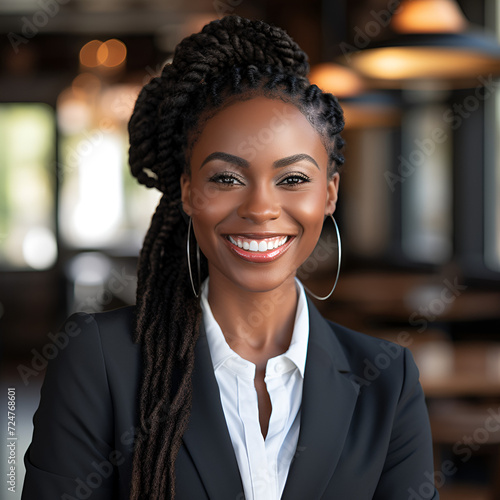 African American Woman, BlackBox braids in updo style, smiling showing pearly white teeth