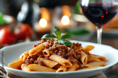 Styled, classic ragout bolognese with penne rigate pasta, high end food photography - Generative AI
