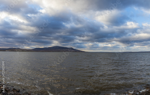 Lake landscape Musov Czech Republic. View of Lake Musov and Palava in the Czech Republic. In the background a television transmitter and the ruins of the castle Devicky.