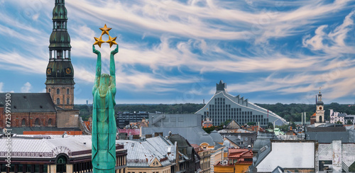 Beautiful sunrise view over Riga by the statue of liberty - Milda in Latvia. The monument of freedom.