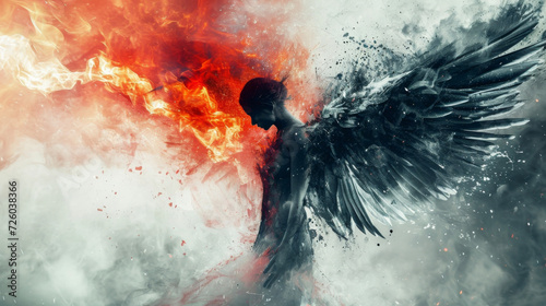 A fallen angel with tattered wings surrounded by ghostly apparitions and fiery hues of red and orange.