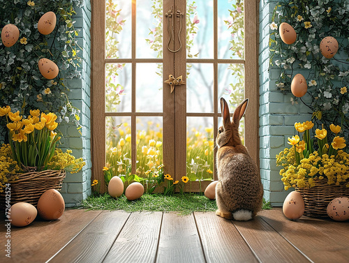 porta addobbata per pasqua, sfondo per fotografi, sfondo per pasqua con conigli e uova di pasqua ideale per inserimento persone