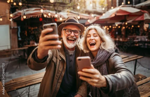Elderly modern couple captures a selfie against the backdrop of the urban cityscape, seamlessly blending ageless connection with the vibrancy of city life.Generated image
