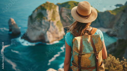 Summer traveling on the coast. Woman with backpack facing a scenic ocean view.