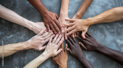 overhead view of multiple hands of diverse skin tones coming together in the center, symbolizing unity and teamwork