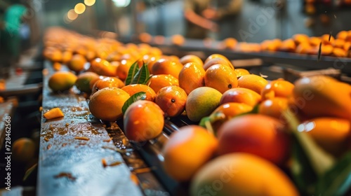 Dynamic composition featuring a conveyor belt with a continuous stream of ripe mangoes, set against a carefully chosen backdrop to highlight the efficiency of the process