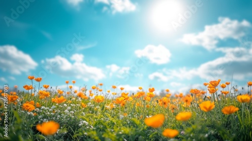 Beautiful natural background with orange flower field and blue sky large copyspace area with copy space for text,
