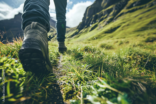 Hiker walks on Mountain Trail. Rear view of hikers man or woman with boots walking.