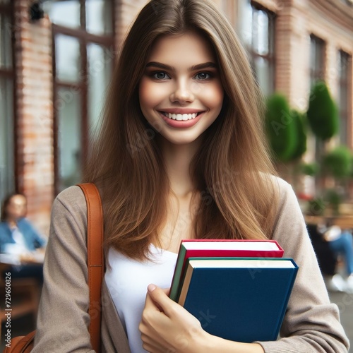 Uma estudante jovem sorrindo segurando os cadernos e livros. Uma aluna simples feliz e sorridente, mulher sorrindo, pessoa alegre, aluna sorrindo com cadernos nas mãos