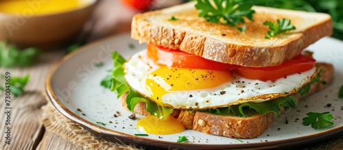 Prepared breakfast sandwich with butter, egg, and tomato on plate.