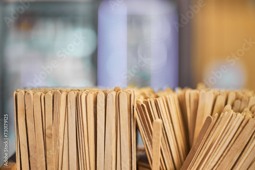 Lots of Wooden disposable stirrers for drinks, tea. Coffee area in a gas station store. stir sticks at self-service zone in cafe, coffee shop or restaurant. Eco friendly recyclable material