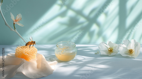 Jar of honey with royal jelly and honeycomb with bee and flowers against light blue background. Dietary supplements. Honey bees products. Apitherapy concept. Traditional medicine.