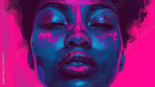 Graphic Novel Style Illustration: African Woman with Neon Pink Face Paint on Pink Background