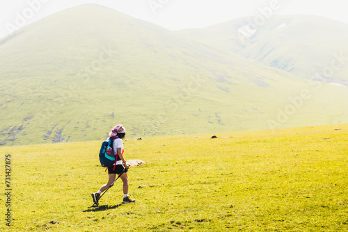 Side view fit sporty female hiker with nordic walk sticks go uphill in green hiking trail in caucasus mountains .Recreational activities and healthy lifestyle concept