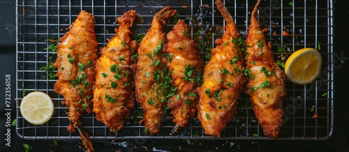 A photo capturing the deliciousness of fried shrimp, cooked to perfection on a wire rack, garnished with a lemon slice. A tempting dish for seafood enthusiasts!