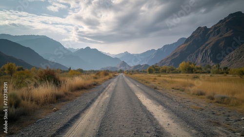 Serene Landscape: Straight Dirt Road Leading Towards Majestic Mountains