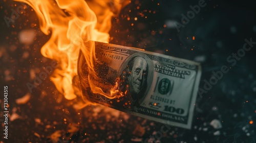 Burning Hundred Dollar Bill in Dramatic Firelight - Burning Money Concept