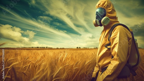 Person in a hazmat suit and gas mask standing in a wheat filed. Concept of toxic pesticide usage.