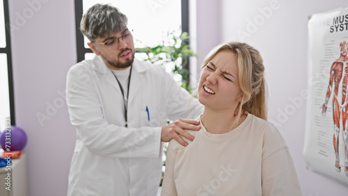 A male physiotherapist evaluates a woman's neck pain in a bright rehabilitation clinic.