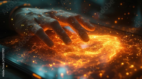 A hand interacts with a high-tech touchscreen surface, where a touch creates a dynamic burst of glowing energy particles.