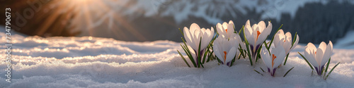 Beautiful snowdrop flower among the snow. Snowdrop forest. Magnificent view of snowdrop formation.