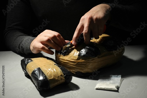 Smuggling and drug trafficking. Man opening package of narcotics with box cutter in darkness, closeup