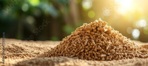 Pile of biomass wood pellets and firewood stack on blurred background with copy space for text