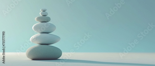 Aufeinander gestapelte Steine vor blauem Hintergrund, Symbol für Balance und Meditation