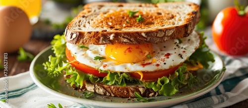 Prepared breakfast sandwich with butter, egg, and tomato on plate.