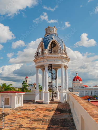 View of City Hall from the terrace of Palacio Ferrer, Cienfuegos, Cuba. Observation rotunda with stairs on the roof of Palace. Cienfuegos, Cuba. Palacio Ferrer, House Of The Culture Benjamin Duarte