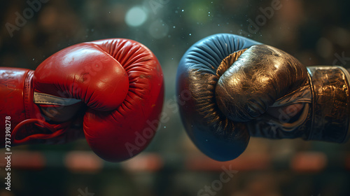 Two male hands in boxing gloves. Sports confrontation.Glove Touch Sportsmanship: Document the moment of sportsmanship as two boxers touch gloves at the start of a match, showing respect for each other