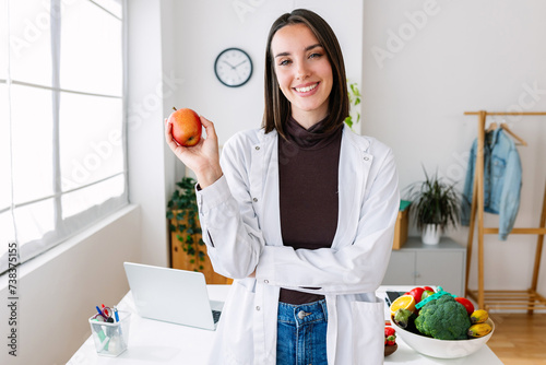 Smiling portrait of young nutritionist woman holding red organic apple at medical office. Healthy lifestyle and nutrition concept.