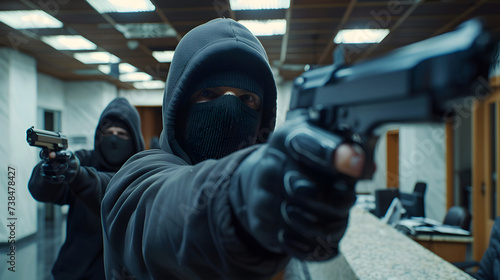 A group of thieves wearing ski masks are robbing a bank, The thieves could be holding guns, and they could be forcing the bank tellers to hand over money.