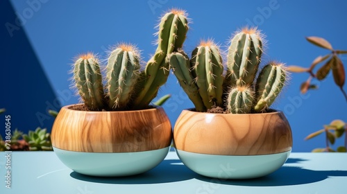 Cacti in wooden pots on a blue background. A wild, unpretentious plant from the desert.