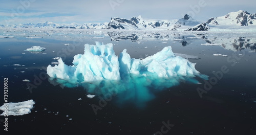 Blue melting ice float polar ocean in Antarctica. Snow covered mountains in background. Ecology, climate change and global warming concept. Polar arctic summer landscape.