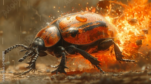 Raindrop on a bombardier beetles back exploding into a scene of volcanic eruptions on a distant alien planet
