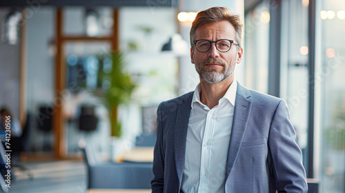Mature businessman in a sharp suit stands confidently in a modern office space, exuding leadership.