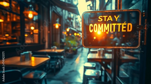 Motivational text stay committed on abstract blurred background, success and inspiration concept.