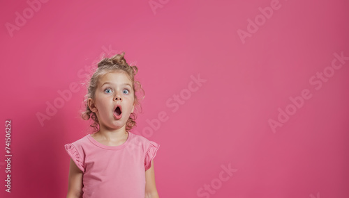 fillette blonde qui a l'air très surprise - fond rose