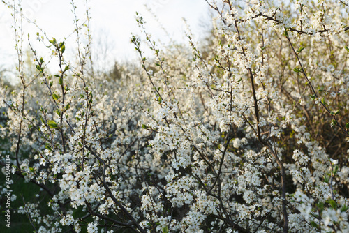 Flowering shrubs of blackthorn (Prunus spinosa) on a sunny spring day