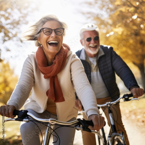 #742318809Happy senior couple ride bicycles together in a sunlit park during autumn. They smile and laugh while cycling on bikes, enjoying active retirement outdoors. This scene shows love and togetherness.
