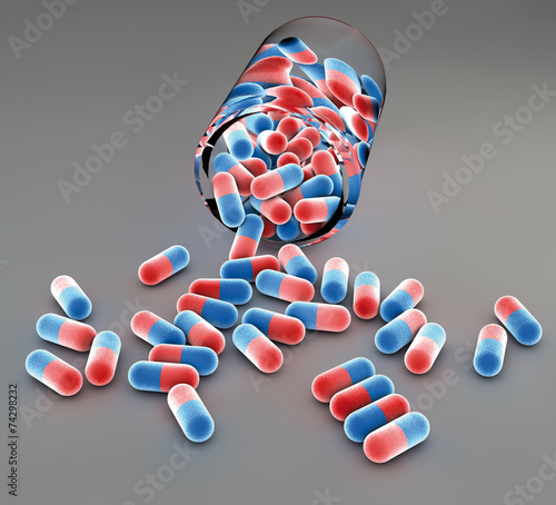 Pillole rosse e blu versate su un piano e contenitore con tappo