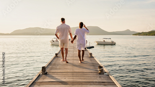 A man and a woman standing on a dock by a lake, holding hands. They are wearing shorts and looking out at the horizon, happy and relaxed during their leisurely travel in Thailand, a couple wooden pier