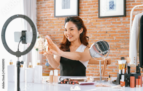 Woman influencer shoot live streaming vlog video review makeup uttermost social media or blog. Happy young girl with cosmetics studio lighting for marketing recording session broadcasting online.
