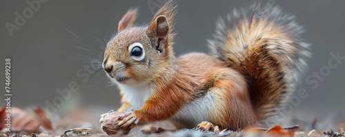 The cute squirrel, with a bushy tail and tiny nut, gazed up with bright eyes in hyper-realistic detail.